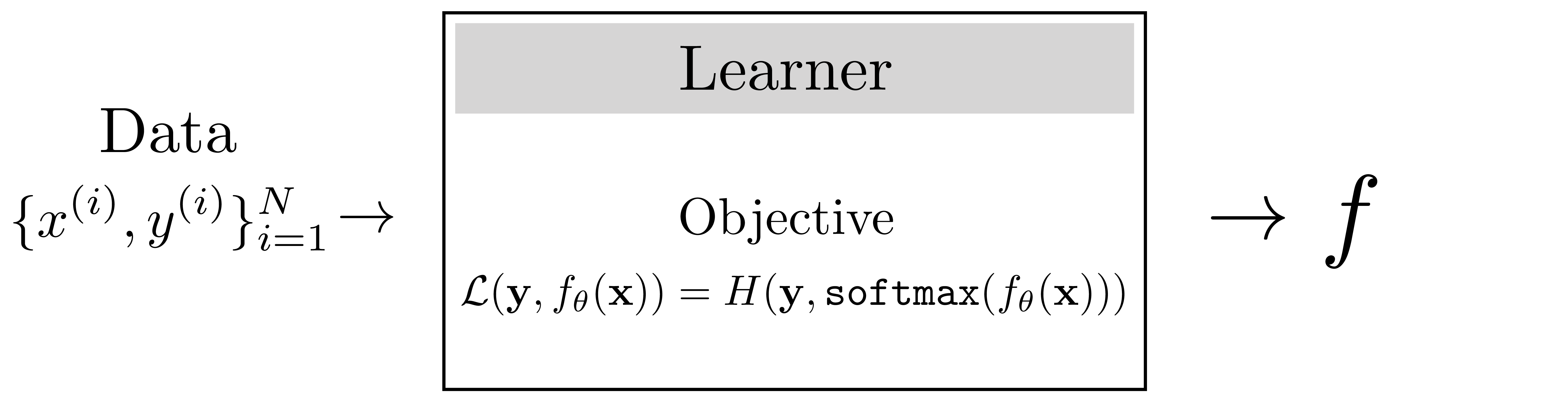 A learner outputs an algorithm, \(f: \mathcal{X} \rightarrow \mathcal{Y}\), which maps inputs, \(\mathbf{x} \in \mathcal{X}\), to outputs, \(\mathbf{y} \in \mathcal{Y}\). Commonly, \(f\) is referred to as the learned function. The objective that the learner optimizes is typically a function that scores model outputs, \(\mathcal{L}: \mathcal{Y} \rightarrow \mathbb{R}\), or compares model outputs to target answers, \(\mathcal{L}: \mathcal{Y} \times \mathcal{Y} \rightarrow \mathbb{R}\). We will interchangeably call this \(\mathcal{L}\) either the objective function, the loss function, or the loss. A loss almost always refers to an objective we seek to minimize, whereas an objective function can be used to describe objectives we seek to minimize as well as those we seek to maximize.