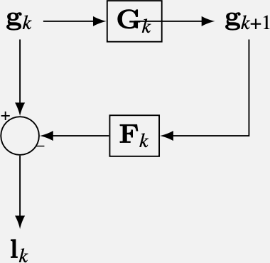 For a two-level Laplacian pyramid with a Gaussian residual, the projection matrix \(\mathbf{P}\) is (Figure 23.14[b]): \[\mathbf{P} = \begin{bmatrix} \mathbf{L}_0 \\ \mathbf{L}_1 \\ \mathbf{G}_1 \\ \end{bmatrix}\]